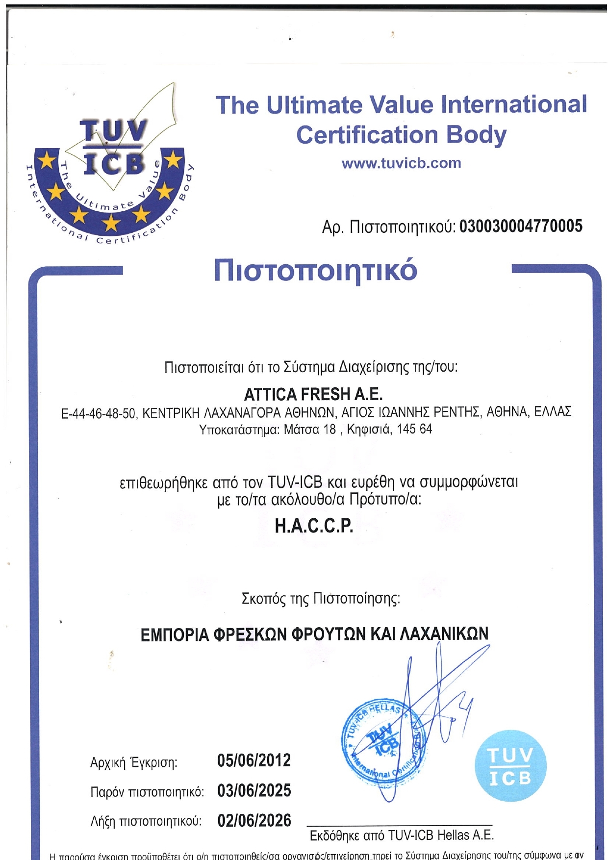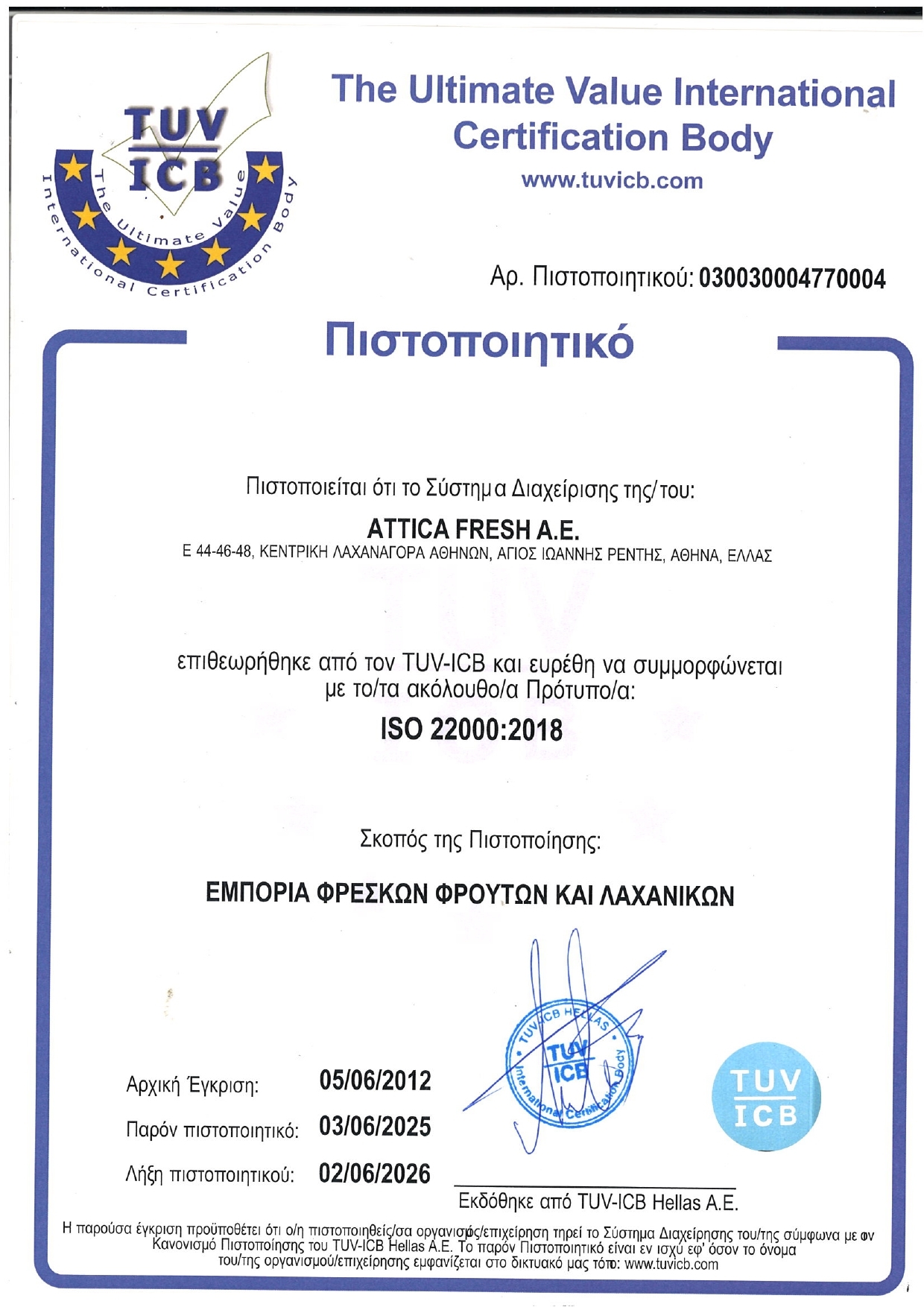 H εταιρεία μας έχει πιστοποιηθεί με ISO 22000:2018 αφού εφαρμόζει και έχει αναπτύξει κατάλληλες δομές προσδιορισμού, παρακολούθησης και συνεχής βελτίωσης των παραμέτρων ασφάλειας τροφίμων της λειτουργίας της.